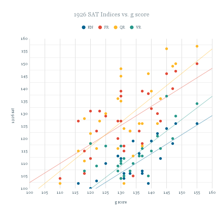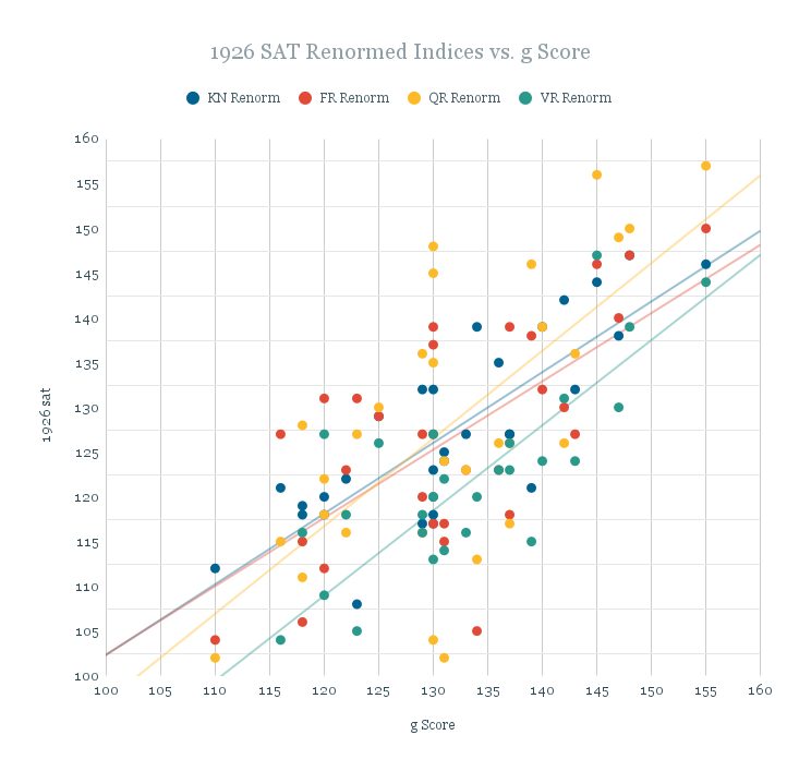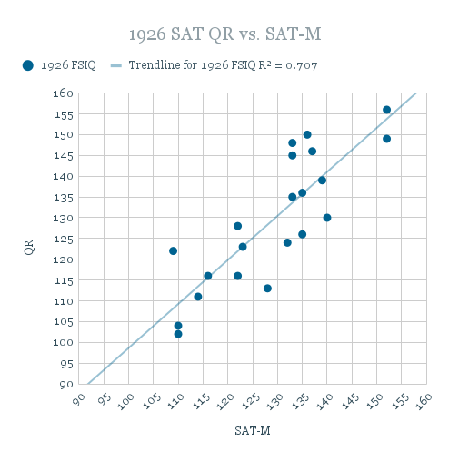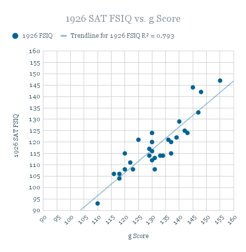 The First Annual Report of the Commission on Scholastic Aptitude Tests 1926 included the original norms from 1926. Using these norms, the 1926 SAT was administered to members of the community with known and validated scores. With 30 validated attempts, their FSIQ was compared to the g score resulting from compositing validated tests on the Big ‘g’ Estimator. Do not confuse correlations to g score with correlations to g.