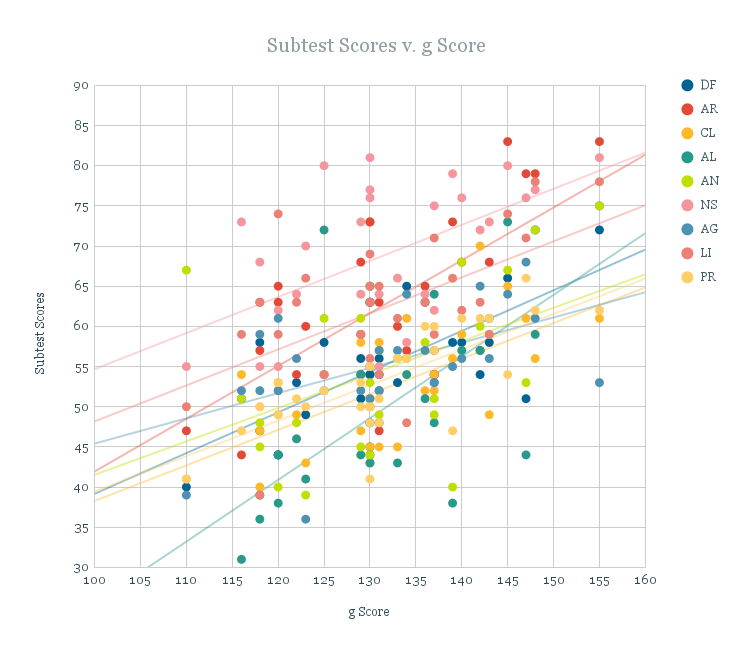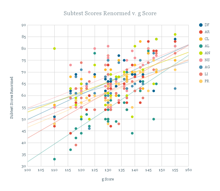 As demonstrated, the verbal subtests, as well as Verbal Reasoning and Knowledge are both deflated in relation to the other more “culture-fair” subtests, however the correlation to g score remains the same. In order to renorm the verbal deflation, we compared the verbal subtest’s norms to the subtest vs. SAT-V score and regressed to those scores. The following subtests were renormed: Definitions, Classification, Antonyms, Analogies, and Paragraph Reading.
