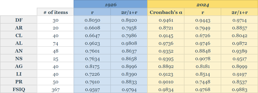 The reliability was calculated by the College Board in 1926 by using the split-half reliability method and Spearman–Brown formula. It was calculated again with the modern sample.