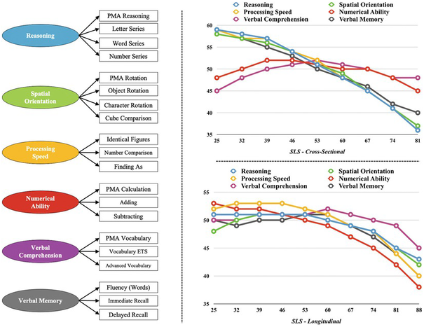 The figure below2 shows the cognitive abilities measured in the Seattle Longitudinal Study2, along with the findings obtained in the cross-sectional and longitudinal comparisons for reasoning, spatial orientation, processing speed, numerical ability, verbal comprehension, and verbal memory. Cross-sectional results show a decline in reasoning, spatial orientation, and processing speed at age forty-six. Verbal memory begins to show decline at age thirty-nine. Numerical ability and verbal comprehension show a smoother developmental pattern. The average difference between the youngest and the oldest cohorts is equivalent to 2 standard deviations. Longitudinal results reveal a significant decline in processing speed and numerical ability at age sixty. Reasoning, spatial orientation, and verbal memory decline at age sixty-seven. Verbal comprehension shows a significant decline at age eighty-one.