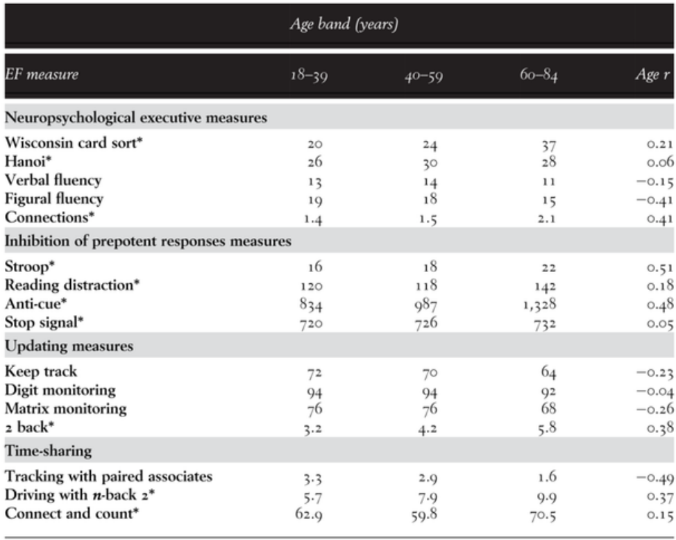 Timothy Salthouse and colleagues (2003)8 asked if executive function may account for age-related intellectual decline. Is this decline attenuated when individual differences in executive functioning are controlled? To answer this question, data were obtained from 261 adults (age range eighteen to eighty-four) who completed a comprehensive battery of tests. Average performance scores across age bands for executive functioning (EF) measures are listed in the table below.