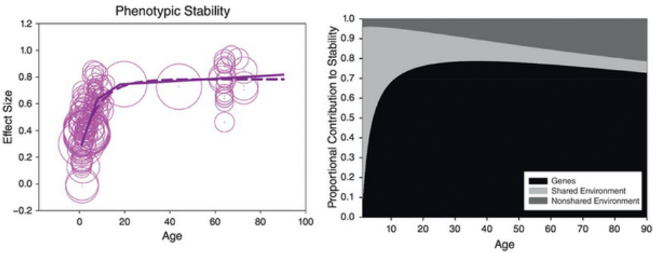 - Shared environment contributes moderately to stability in childhood (effect size 0.24), and this contribution fades to zero values by middle adulthood.