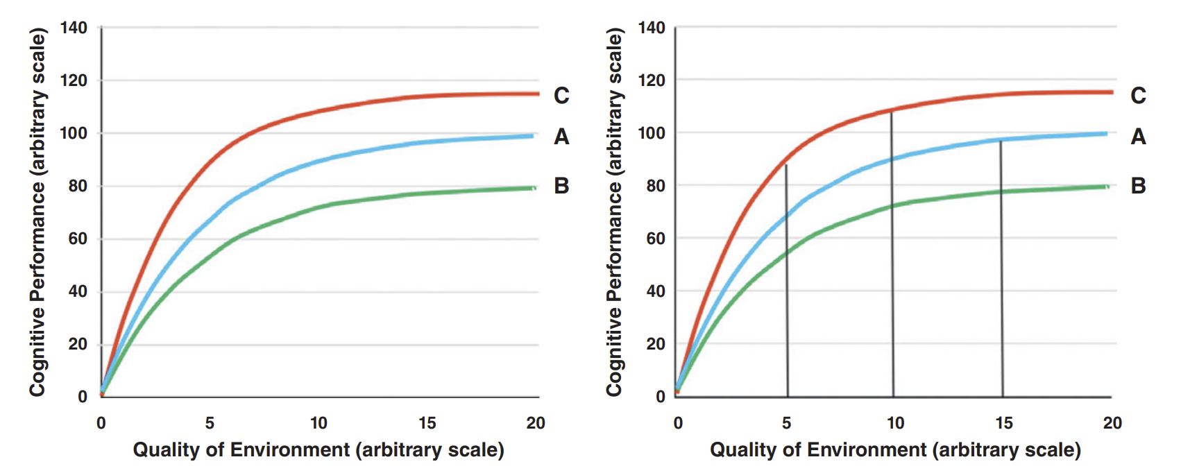Figure 833 helps visualize how genes and environment work together to shape intelligence. The reaction range idea shows that genes don't fix a single IQ score, but set a range of possible outcomes, with environment determining where someone ends up within that range. Poor environments can suppress cognitive development for almost everyone, while moving from very bad to decent conditions can produce large gains. However, there are diminishing returns to gains and differences between people will increasingly reflect genetics as individuals approach their ceilings. This explains why environmental interventions can raise average IQs without eliminating stable differences between individuals.