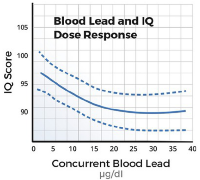 The graph below depicts the function relating blood lead levels and IQ scores and the sobering main conclusion of Lanphear's perspective article10: "An increase in blood lead from <1 µ/dL to 30 µ/dL was associated with a 9.2 IQ deficit, but the largest fraction of this deficit (6.2 IQ points) occurred below 10 µ/dL. … Despite the dramatic decline in blood lead levels, lead exposure accounts for a loss of 32 million IQ points in a 6-year birth cohort of US children".