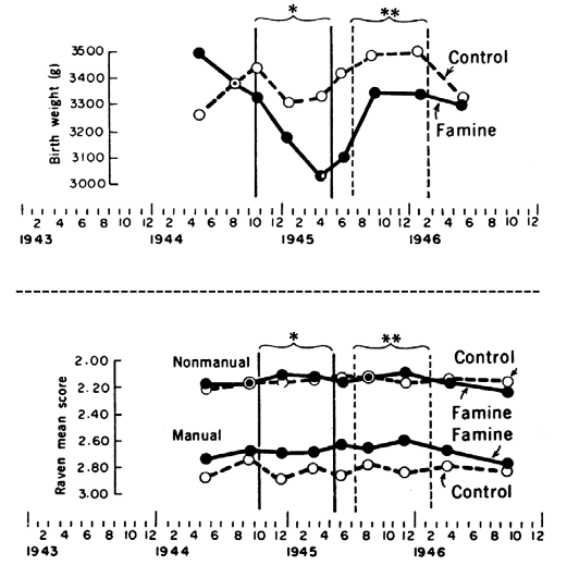 In the Netherlands postwar, men register for military service at age nineteen. All registrants complete a progressive matrix test. Zena Stein and her colleagues (1972)[tk] from Columbia University compared the scores of men who were in utero or neonates while living in the northern Dutch cities during the months of the starvation period to the scores of men who had been born at the same time but had lived in the cities under Allied control. Other records of mental ability, such as the frequency of mental disability, were also compared across the two populations. There was no difference in any indicator of mental competence. This study of more than 125,000 men provides striking evidence of the resilience of human cognition. Apparently, any effects of severe short-term malnutrition are not permanent. The key results are shown below. However, chronic, prolonged malnutrition shows different results.